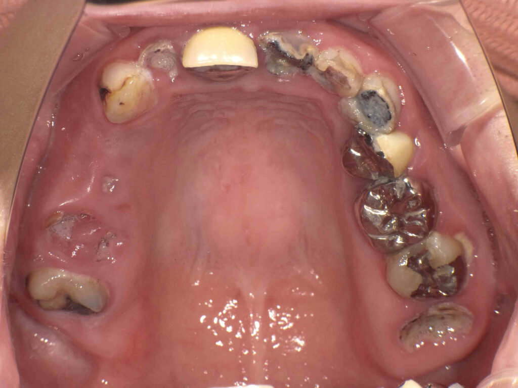 右上欠損部にはインプラントを計画。前歯は2本抜歯してグラデーションジルコニアブリッジ、左上はフルジルコニアとセレックを計画。